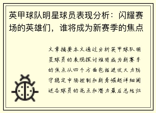 英甲球队明星球员表现分析:闪耀赛场的英雄们,谁将成为新赛季的焦点?